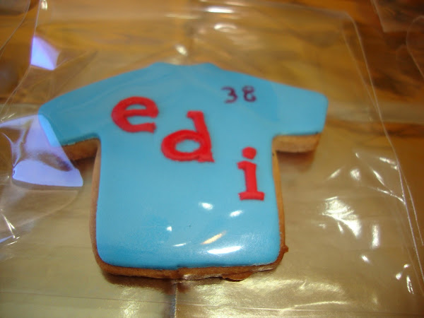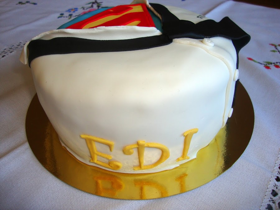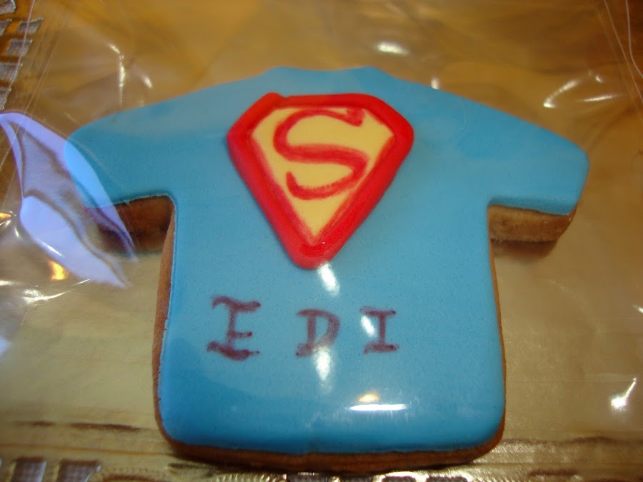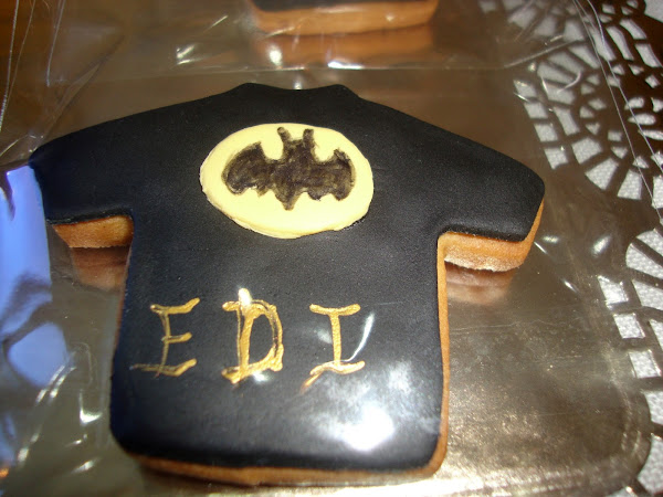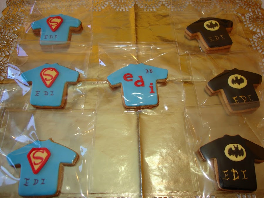 La tarta se acompañaba de unas galletas de mantequilla y speculous decoradas en fondant con los logos de Superman y Batman.