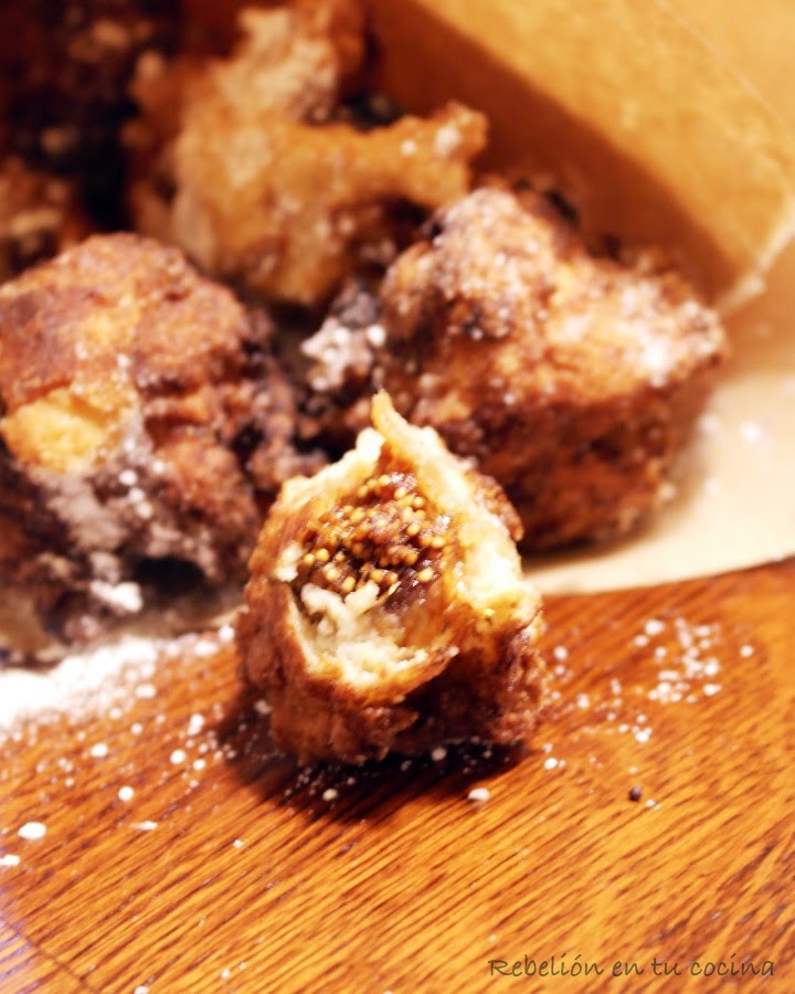 Ponemos en una sartén abundante aceite y vertemos la masa anterior con un higo en el interior (conseguir que la masa envuelva el higo me ha resultado difícil ya que la masa no se adhería al higo, hay que poner bastante masa y ayudarte con una cuchara para que quede el higo bien envuelto) Freír el buñuelo y espolvorear con azúcar glass. Y por cierto quitar el rabo de los higos secos no hagáis como yo que se me olvidó (pero se pueden comer, es como me dijo un amigo: "comer con cuidado como con las aceitunas con hueso", aunque en este caso no es tan duro)