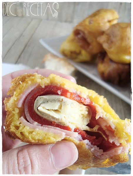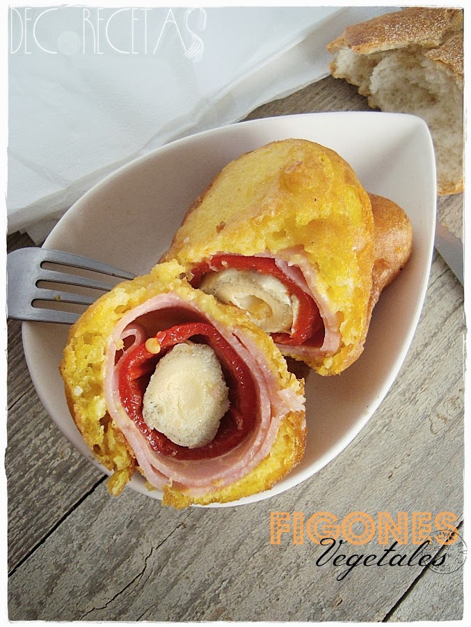 Metemos la alcachofa dentro del pimiento de piquillo envolvemos con la tira de jamón de york ponemos un palillo para que no se abra y rebozamos en la mezcla de el figón. A continuación freímos en abundante aceite y depositamos en papel absorbente para quitar el exceso de grasa