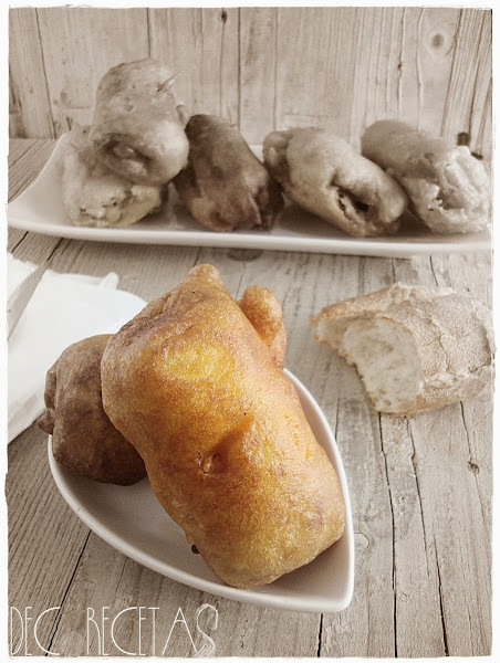 Preparamos la masa donde los rebozamos. Para ello la haremos como habitualmente, (receta aquí) no tiene más que mezclar todos los ingredientes menos la clara de huevo montada dejando reposar una hora para que leve y añadir la clara montada en último momento