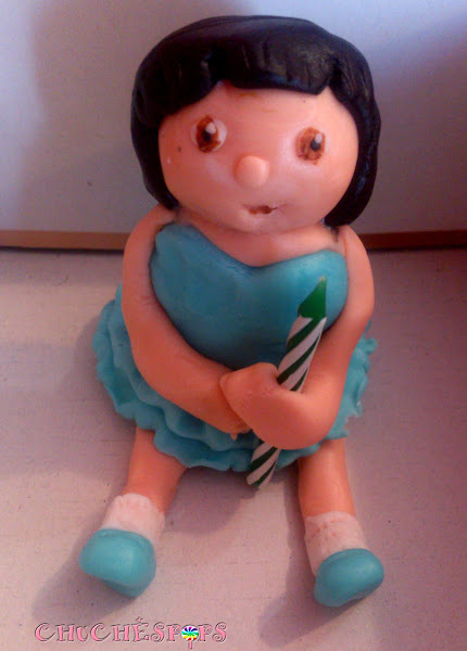 Como Natalia quería una vela de Dora su frase exacta fue " Una tarta de Chocolate de Dora y la vela de Dora" pues eso, encargue la Tarta y me puse manos a la obra con mi Dora de Fondant.Natalia tiene una dora con un vestido azul, que le gusta mucho, y como no quería hacer la Dora de Siempre con su pantalón y su camiseta, (vamos que me revelé con tanta Dora je,je,je.) le hice con un vestido azul de bailarina.