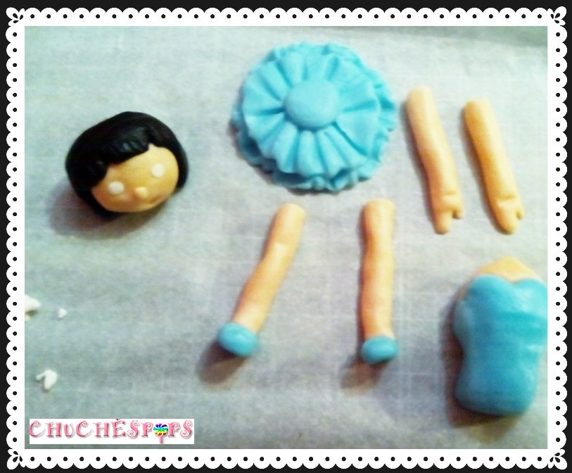 Después de unir con un palillo cabezay cuerpo, y falda y cuerpo con otro, le pegué los brazos con agua al cuerpo y las piernas a la falda, después cogí un trozo de fondant para sujetar las piernas a la falda para que no se cayeran al mover la figura.