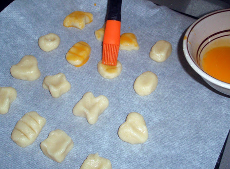 Cuando ya están todas las figuritas formadas, batimos la yema del huevo con unas gotas de leche o de agua y pintamos con ella las figuritas..
