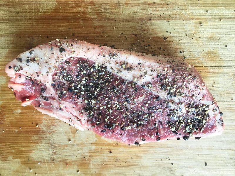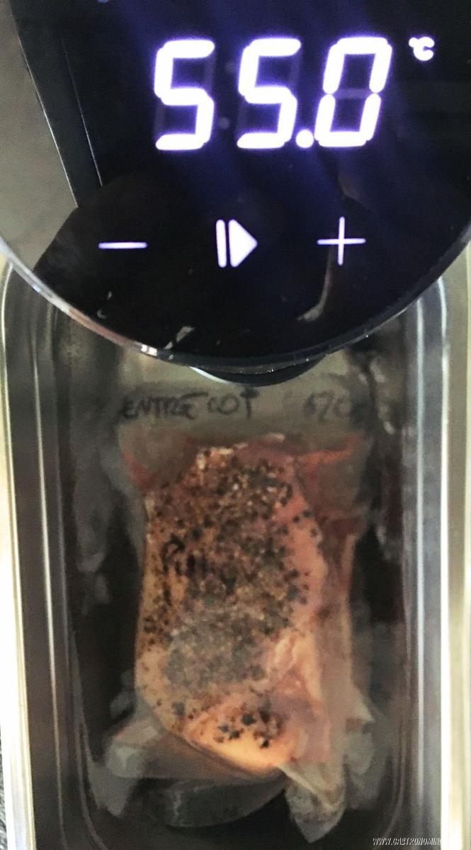 1. Calentamos el circulador a 55ºC – 131ºF Triturados los granos de pimienta los rociamos sobre la carne y presionamos un poco para que se peguen bien, envasamos la carne al vacío.2. Metemos al jacuzzi y cocinamos a 55ºC – 131ºF – 2 horas.
