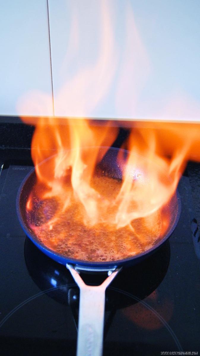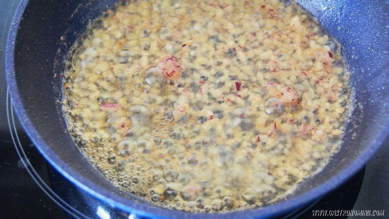 5. En la misma sartén, añadimos la mantequilla, la chalota y sofreímos a fuego medio.6. Agregamos el cognac y flambeamos, no te olvides apagar tu campana extractora por seguridad, evaporamos el alcohol.