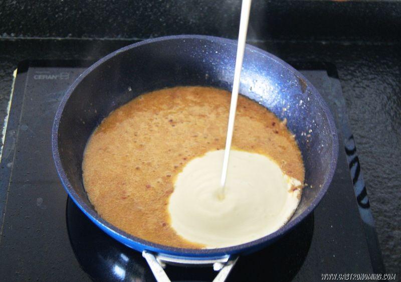 8. Echamos la nata (crema de leche) y dejamos reducir hasta obtener la consistencia deseada. Añadimos sal y retiramos del fuego.
