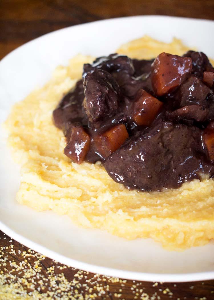 Aunque parece muy elaborado, en realidad es un platillo muy práctico, simplemente hay que sellar la carne y agregar los ingredientes de la salsa. ¡Después puedes olvidarla durante dos o tres horas! Para preparar la polenta, yo recomiendo usar 3 partes de caldo por cada parte de polenta, pero dependiendo de la marca que compres, puedes agregar un poco más o menos de líquido. Recuerda moverla constantemente durante la cocción.