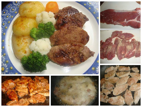 Sazonamos todas las rebanadas de carne por ambos lados, calentamos muy bien una sartén antiadherente, cuando está a buena temperatura cocinamos la carne, no le estés dando vuelvas y vueltas, pues sólo lograrás que se le salga todo el jugo, debes esperar unos minutos, hasta que calcules o levantando una esquinita veas que ya se doró muy bien la carne por ese lado, y si es así, la volteas, esperas otros minutos y cuando está toda lista le agregas el refresco de cola y la cerveza, tapas la sartén y dejas cocinando a fuego medio bajo hasta que se haga un tipo jarabe o miel, pues con los azúcares que contienen estas dos bebidas se espesará y caramelizará, de hecho si quieres que quede más dulzón el sabor, puedes utilizar el refresco de cola de la etiqueta azul, pues contiene mayor cantidad de azúcares y en ocasiones, dependiendo lo que cocinarás, es mejor opción que el de etiqueta roja para hacer ciertos platillos... ustedes elijan... procuren que no se consuma toda la salsa, para que no queden resecas las piezas de carne; si no las vas a servir en ese momento, retíralas de la sartén y colócalas en un recipiente hermético, y hay que taparlo.