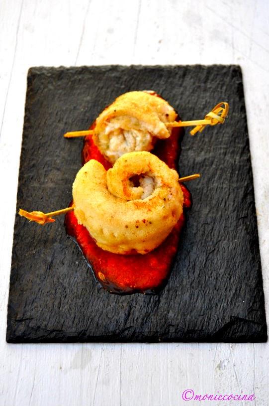 Luego escurrimos un poco en papel de cocina, enrollamos con un palillo y freímos en aceite bien caliente, lo sacamos y servimos sobre una cama de salsa brava que hago muy regularmente y que podéis encontrar la receta AQUI, en mis patatas bravas invertidas.