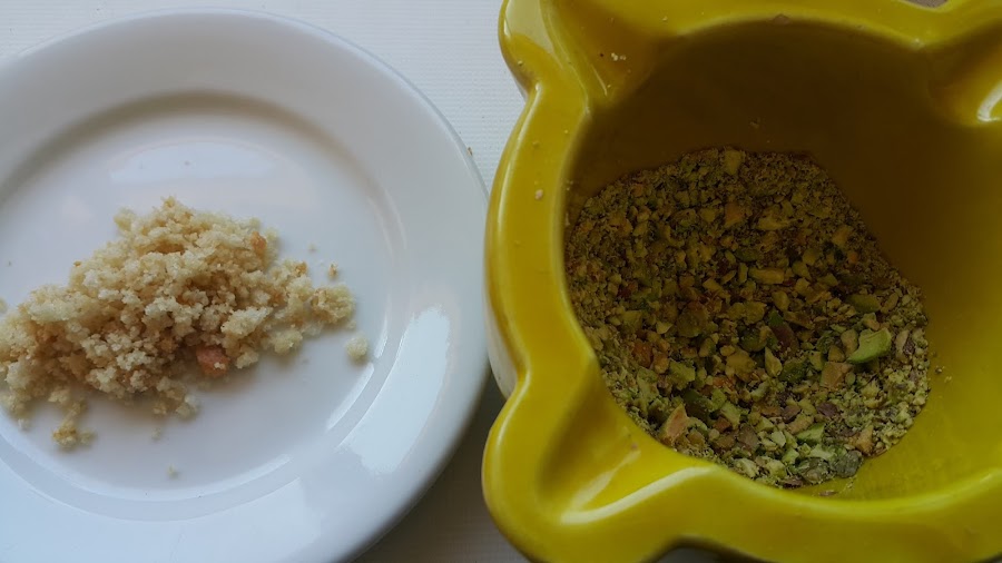 Mientras en un mortero machacamos el pan frito y los pistachos.