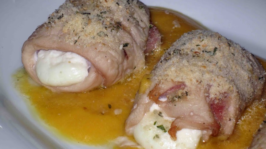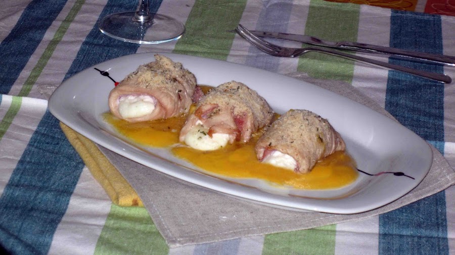 Por otro lado, aplastamos un poco los filetes de pavo, le ponemos una loncha de jamón de york y un trozo de queso fresco de cabra, enrollamos y sujetamos con un palillo. En una fuente acta para horno,untamos el fondo con un poco de aceite, encima los filetes y ponemos en el horno( que ya tenemos calentado), durante 10 minutos,a 180º.