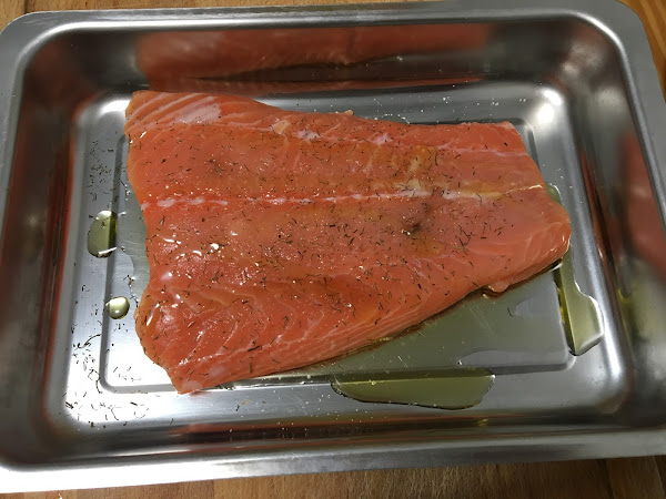 Mientras estamos haciendo las patatas podemos preparar una fuente para horno. Le ponemos aceite en el fondo, le colocamos el filete de salmón, un poco de eneldo y lo metemos en el horno.