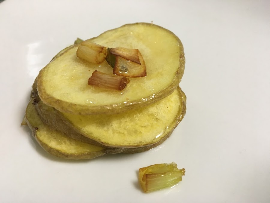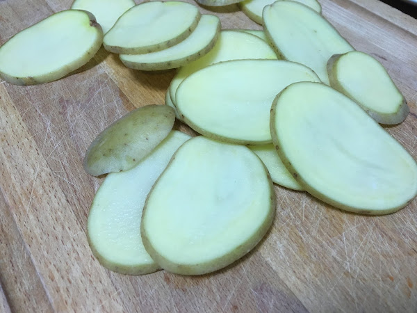 Limpiamos dos patatas medianas y las cortamos en rodajas finas con una mandolina.