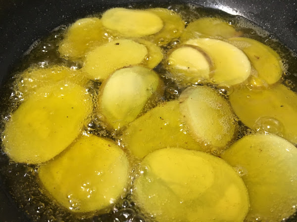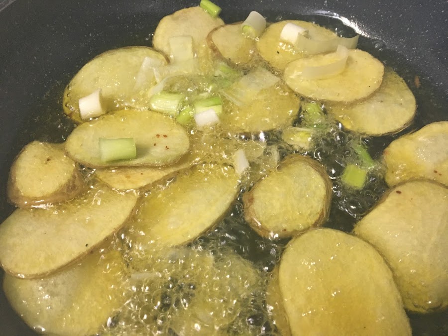 Un momento antes de retirar las patatas le añadimos al aceite un ajito tierno cortado a rodajitas. Lo mezclamos con las patatas y retiramos.