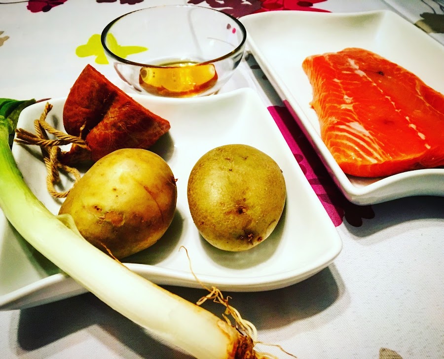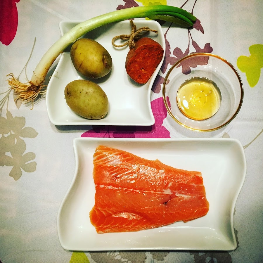 Para servir vamos a hacer un montón de patata con ajito tierno frito y en el centro del plato pondremos el filete del salmón.