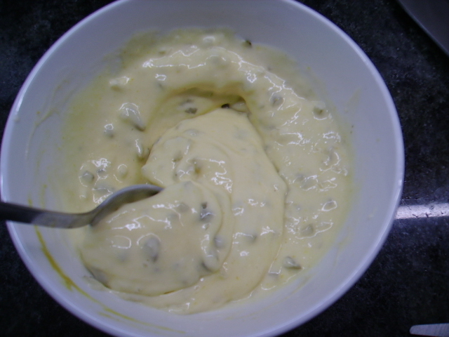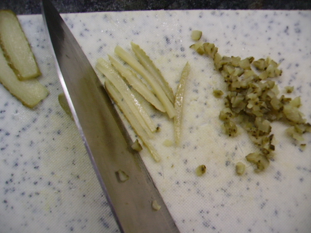 4.- Picamos los pepinillos muy menuditos y lo sumamos a la mayonesa junto con la cucharadita de mostaza, el perejil y removemos todo.