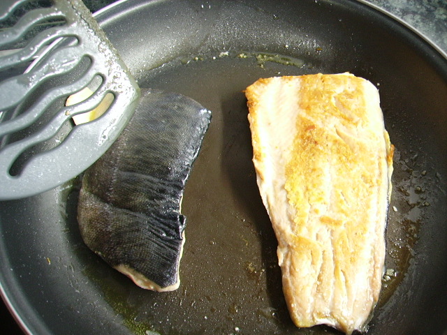 5.- Damos la vuelta al salmón comprobando que esté dorado.
