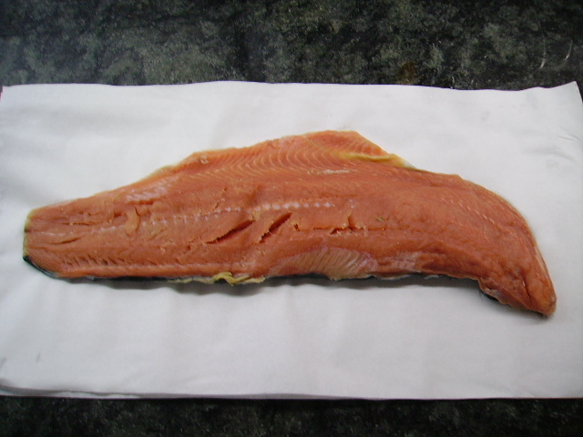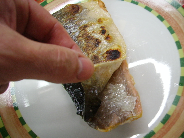 6.- Cuando esté listo lo apartamos y con cuidado quitamos la piel al salmón. Si está bien hecho resultará fácil quitarla.