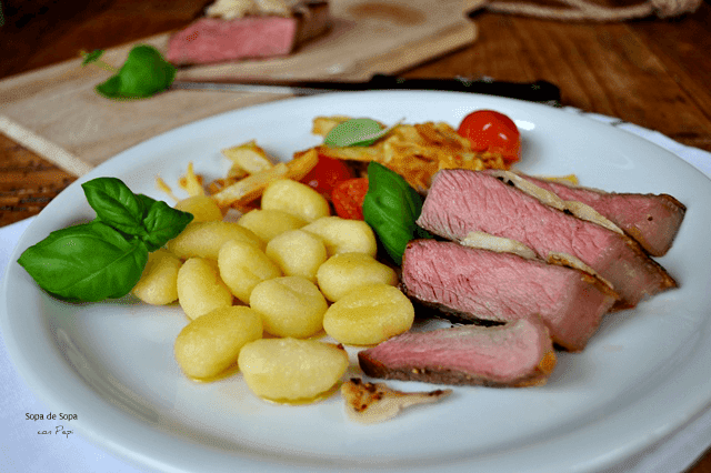 Para servir, trinchar la carne en tiras y acompañarla con las verduras y los Gnocchis.