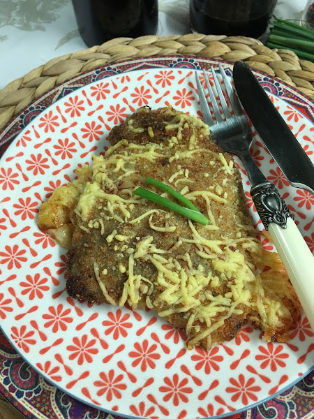 Se sacuden los filetes un poco para que suelten el ajo y el perejil (reconozco que a mi me encantan así, así que no los sacudí mucho) y se pasan, primero por la mantequilla y luego por el pan y queso rallados: