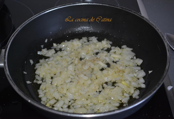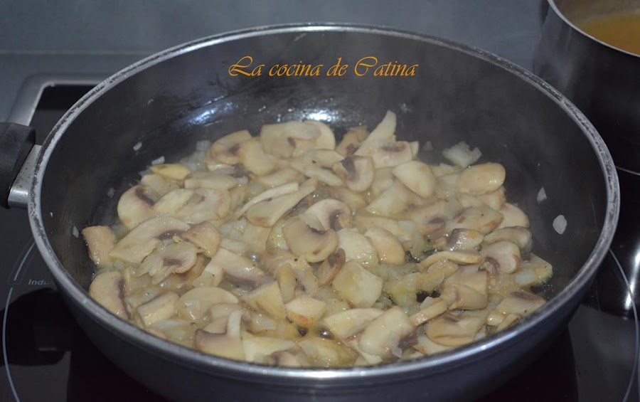 Calentamos el aceite en una sartén y freímos la cebolla a fuego lento durante 3 o 4 minutos con cuidado de que no se queme, añadimos los champiñones y rehogamos otros 5 minutos hasta que la cebolla esté transparente.