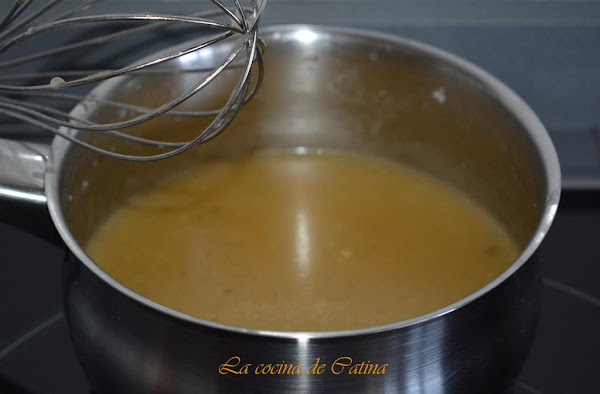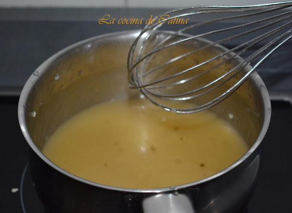 Añadimos el caldo poco a poco, batiendo continuamente con unas varillas. Cuando lo hallamos añadido todo, subimos el fuego, hasta que empiece a hervir, sin dejar de batir. Lo volvemos a bajar y dejamos hervir durante un minuto. Retiramos del fuego.