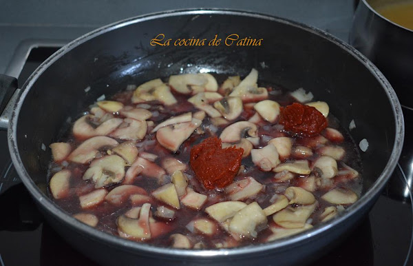 Añadimos el vino y el tomate, removemos, aumentamos el fuego y cuando empiece a hervir mantenemos unos 5 minutos hasta que el vino se evapore y quede reducido a una tercera parte aproximadamente. A esta mezcla le añadimos el consomé que teníamos reservado, mezclamos bien y llevamos a ebullición y cuando empiece a hervir retiramos del fuego.