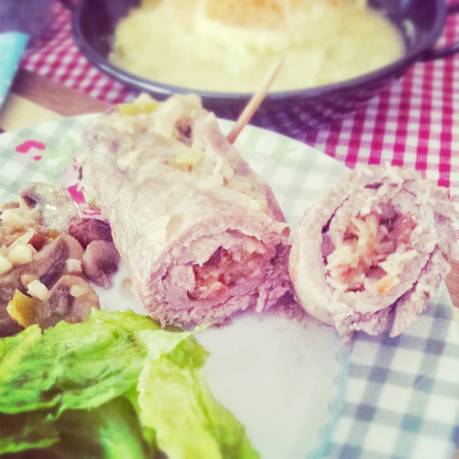 El siguiente paso será rellenar los filetes con el sofrito que no utilizaremos todo porque el resto nos servirá como salsa para hacer los filetes, no hay que echar mucha cantidad porque sino se nos saldrá por los lados al enrollarlos. Cuando estén rellenos lo sujetamos pinchándoles un palillo.