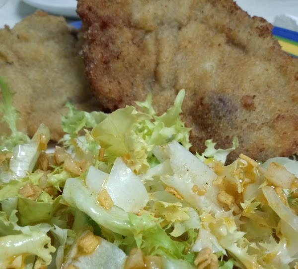 Este mes nos ha tocado asaltar a Los Blogs de María, y en cuanto ví sus Chuletas de cerdo a la mostaza con ensalada de escarola... lo supe al instante, esa iba a ser mi receta, pero siempre lo dejo todo para último momento... horror!! al ir a comprar no había chuletas, así que me llevé unos filetes de cabeza de cerdo.