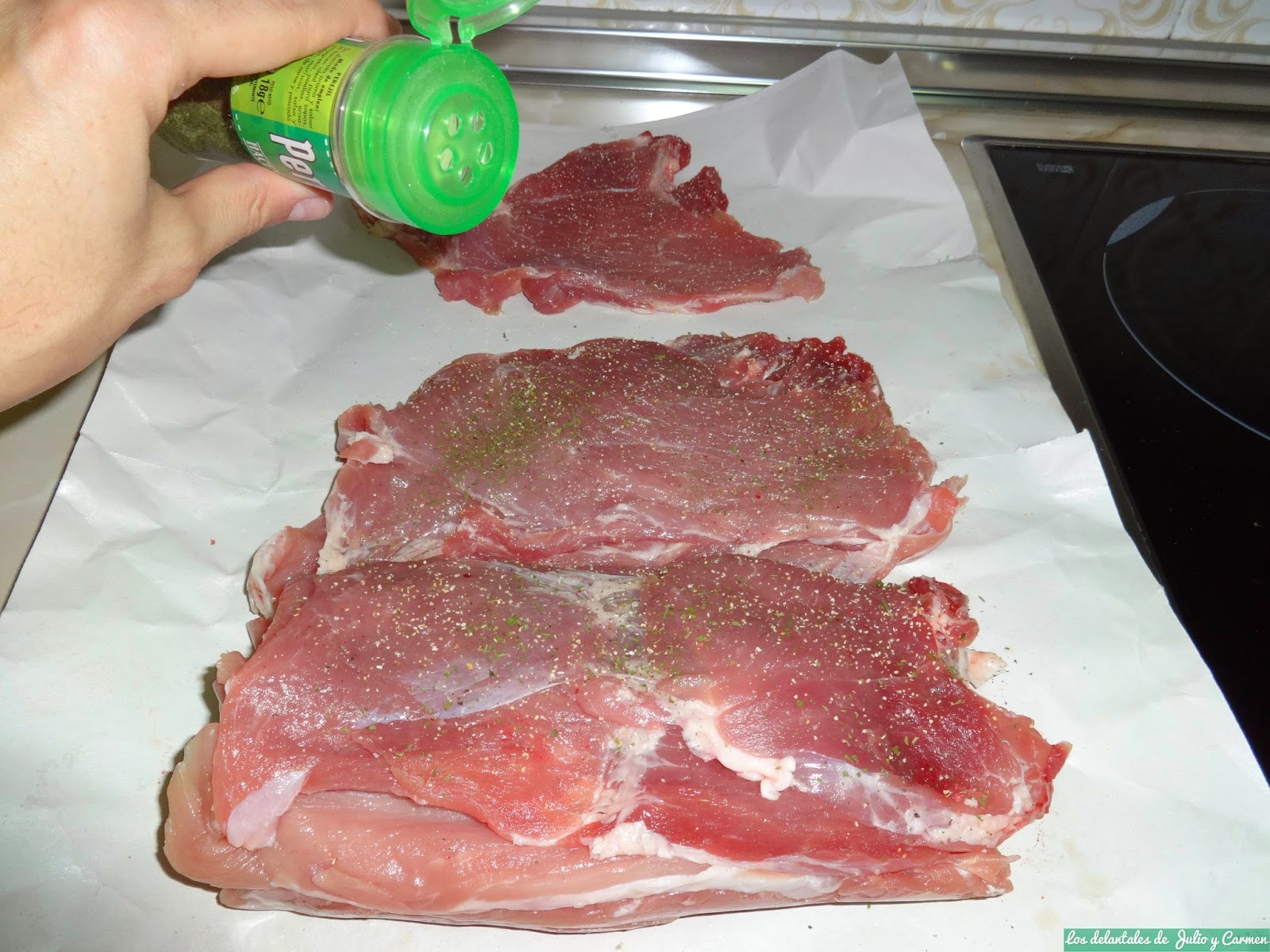 Una vez tenemos listas las patatas gajo, lo siguiente es preparar los filetes de cerdo: para su elaboración, echaremos perejil, ajo y pimienta molida en cada uno y los pasamos por la plancha hasta dejarlos al punto de cada uno. Los sacamos y salamos al gusto.