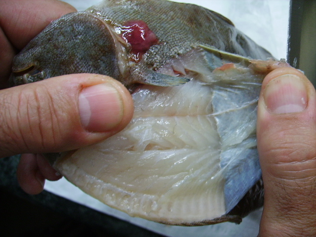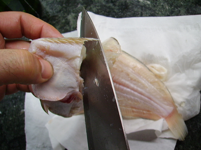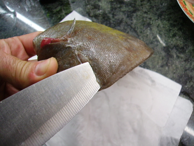 1.- Cogemos el lenguado por la cabeza y hacemos un corte superficial oblicuo.