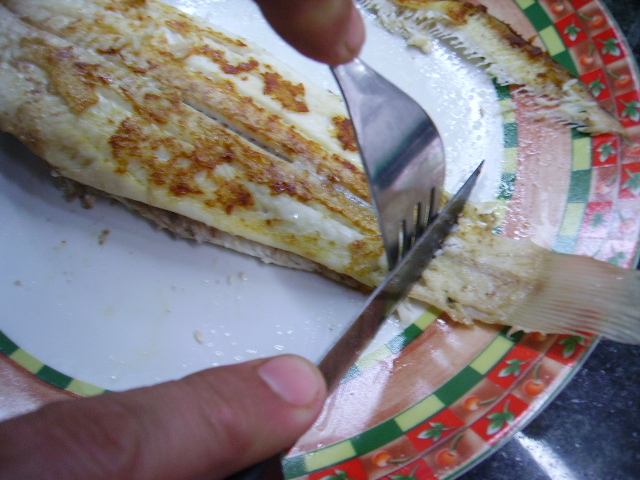7.- Para limpiar una vez hechos apartamos en un plato y sacamos las espinas laterales haciendo una presión con la hoja del cuchillo y tirando hacia afuera, Poco a poco lo vamos haciendo en todo el lateral (ver foto 11 y 12)