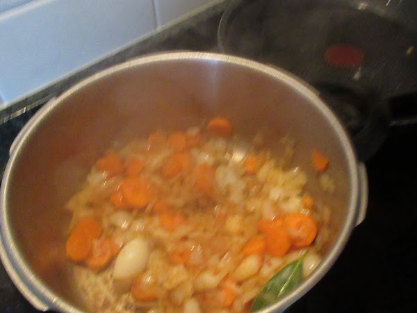 Ponemos en el aceite usado, los dientes de ajo pelados y la cebolla troceada, rascamos el fondo para recuperar los jugos soltado del lomo, veremos que la cebolla se empieza a poner oscura, añadimos el laurel y la zanahoria cortada en rodajas, sofreímos durante 10 minutos a fuego medio para caramelizar la cebolla, añadimos el vasito de agua y tapamos, cocemos alrededor de 15 minutos.