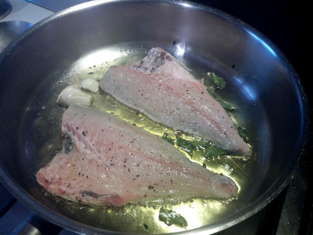 Calentar el aceite y cuando esté caliente, poner los filetes de lubina, por la parte de la piel (fuego moderado).