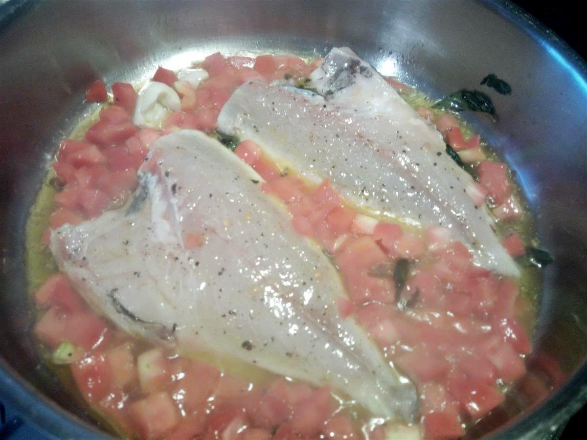 Salpimentar, añadir agua y vino blanco, poner tapadera y fuego al minimo y cocinar durante 16-18 minutos. De vez en cuando, salsear la superficie de los filetes usando una cuchara.