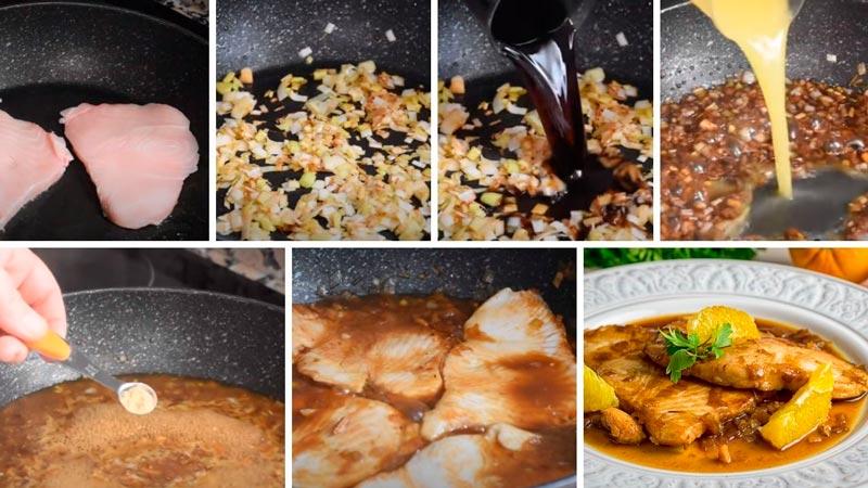 Una vez que el vino ha reducido, ponemos el zumo de naranja natural, salpimentamos al gusto y echamos una cucharadita de jengibre en polvo.
