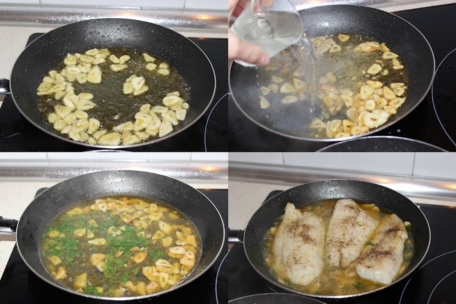Ponemos un poco de aceite en una sartén y freímos los filetes salpimentados por los dos lados. Los retiramos y freímos los ajos laminados en el mismo aceite. Cuando empiecen a dorar añadimos el vino blanco, el perejil picado y la media pastilla de caldo de pescado.