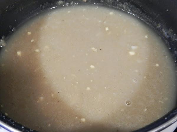 Apartamos del fuego con la intención de no quemar la harina y allí añadiremos cuatro cazos de repartir, de caldo de pescado.