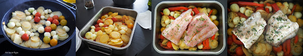 Servir el mero sobre un lecho de patatas y pimientos y colocar cebollitas y tomatitos alrededor.