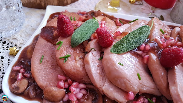 3.- Incorporamos los champiñones, los granos de la granada y las frambuesas. Introducimos unas hojas de salvia, añadimos un poco de sal. Cocinamos la salsa unos 5 minutos a fuego medio, vertemos 1/2 vaso de agua y los filetes de pavo. Dejamos que todo se cocine 2 minutos. Retiramos los filetes del fuego. Servimos el plato con una frambuesas frescas, unos granos de granadas sin cocinar por encima. Unas hojas de salvia y un poco de cebollino fresco por encima.
