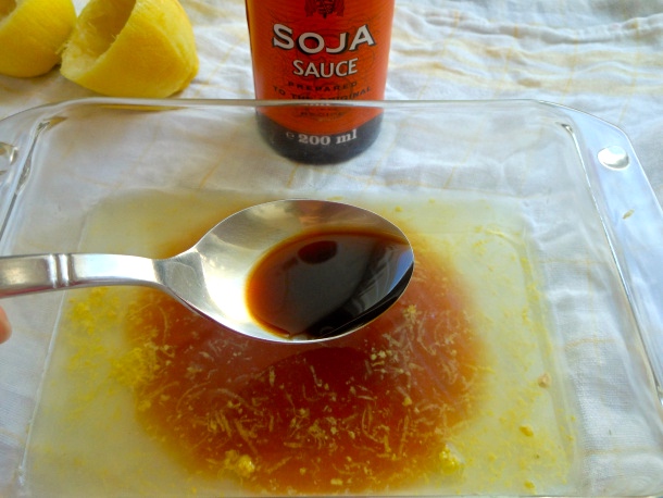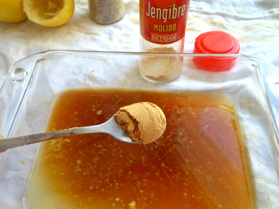 Añade a continuación las dos cucharaditas de salsa de soja, la cucharadita de jengibre rallado, la media cucharadita de sal fina, la media de pimienta negra molida y dos cucharadas de aceite de oliva.