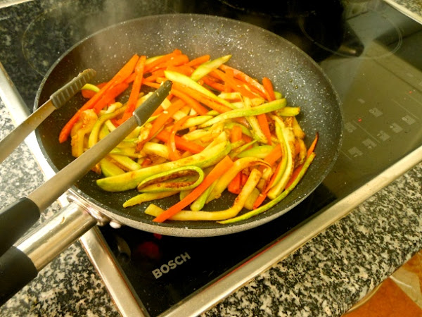 Después añade las tiras de calabacín y saltea todo junto 3 minutos más.