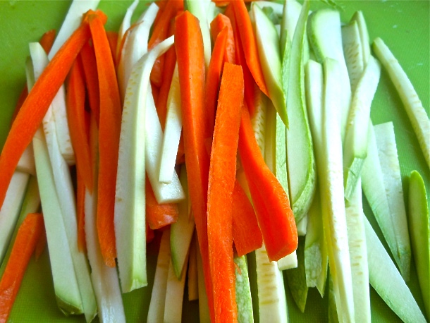 Tras esto raspa la piel de las zanahorias y córtala también en tiras.