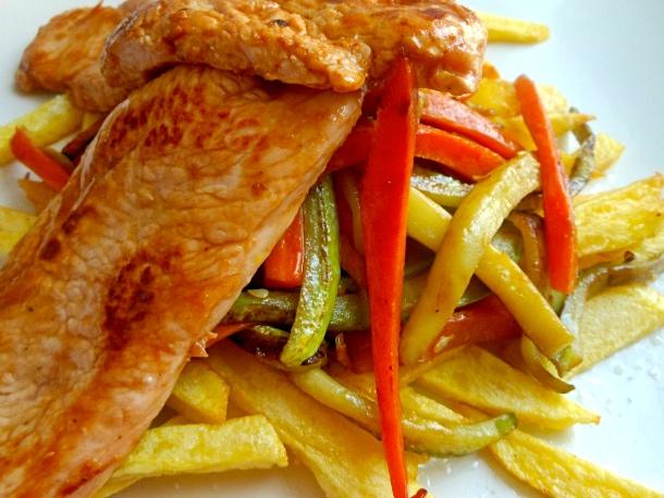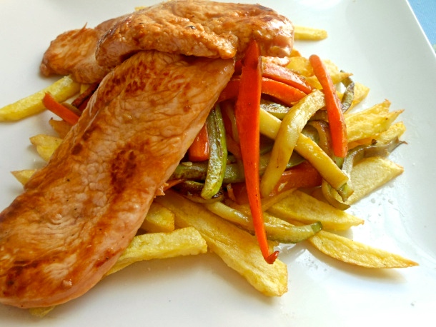 Saca ahora los filetes de pavo del macerado, sécalo un poco con un un trozo de papel de cocina y ásalos en la sartén junto a dos cucharadas de aceite de oliva.
