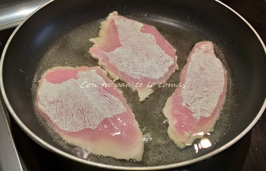 3. Mientras se hace la salsa sazonamos los filetes de pavo, los pasamos por harina y los freímos en otra sartén con aceite de oliva.
