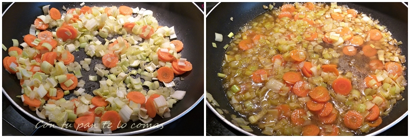 1. Picamos la cebolla y el puerro en brunoise (cuadraditos) y las zanahorias en rodajas finitas para que no nos queden duras.