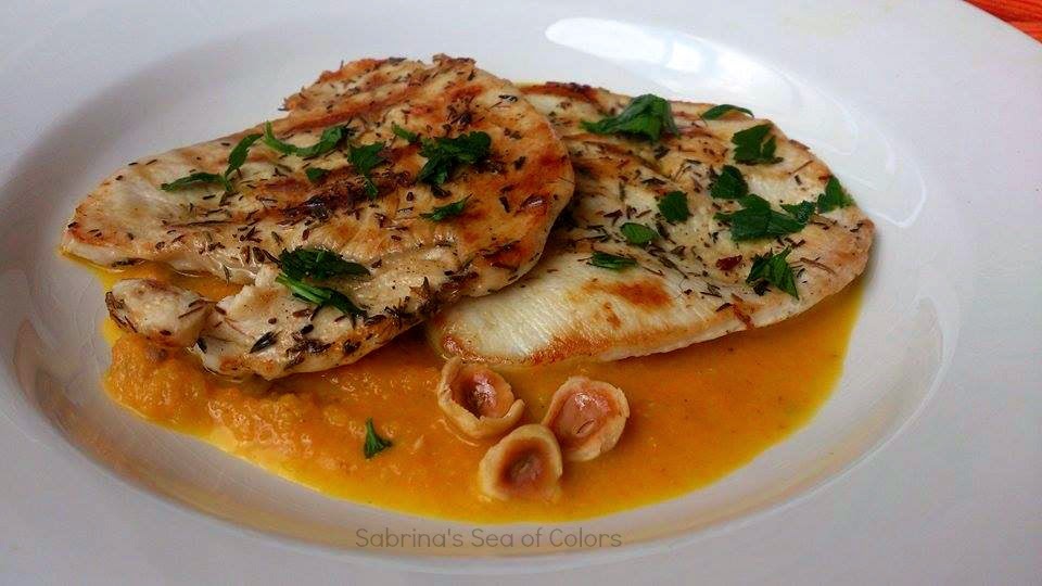 Filetes de pavo sobre puré de zanahoria y avellanas