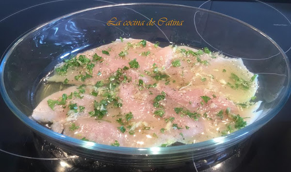 Lavamos los filetes de pechuga y los escurrimos bien, los colocamos en una fuente y le ponemos sal, pimienta, el perejil picado, el ajo picado y un buen chorro de aceite de oliva. Untamos bien los filetes con esta mezcla y los dejamos marinar un par de horas en el frigorífico.Precalentamos el horno a 150 grados.