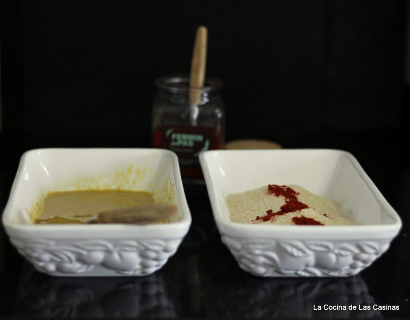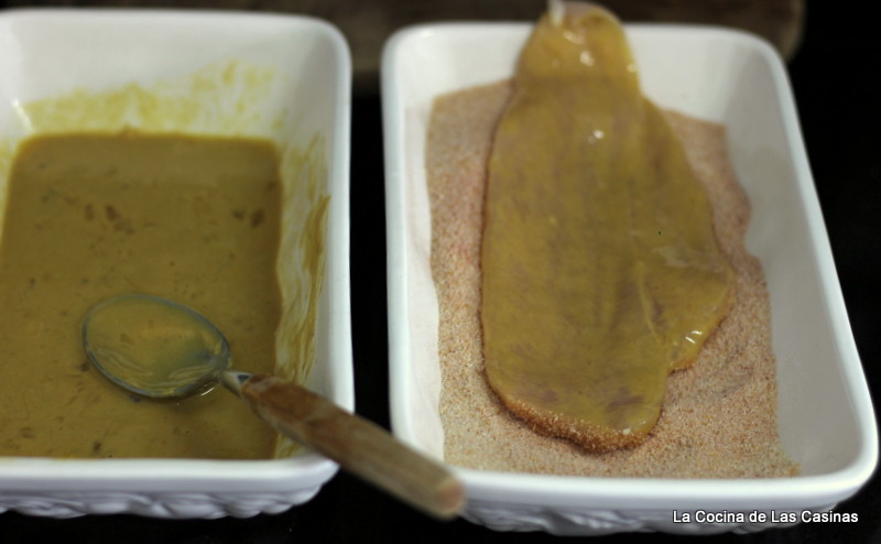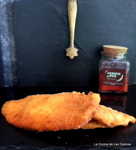 Unta los filetes por los dos lados, pasa por el pan rallado, el panko , los copos de maiz desmigados o lo que tengas que has mezclado con el pimentón,