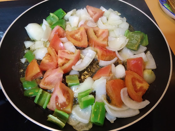 Cortamos a trozos la cebolla, pimiento y tomate y los rehogamos en una sartén amplia con un chorreón de aceite y sal al gusto.